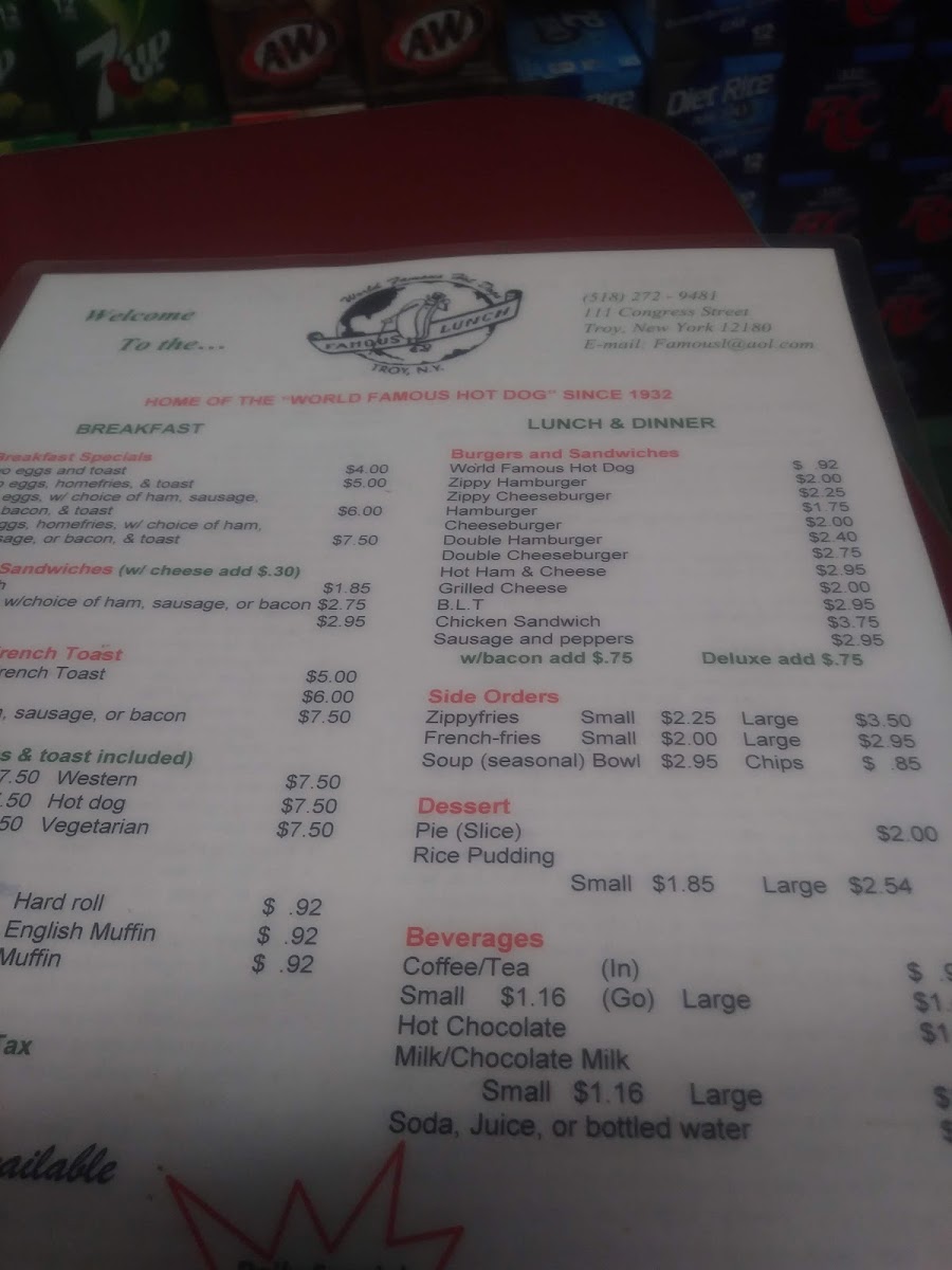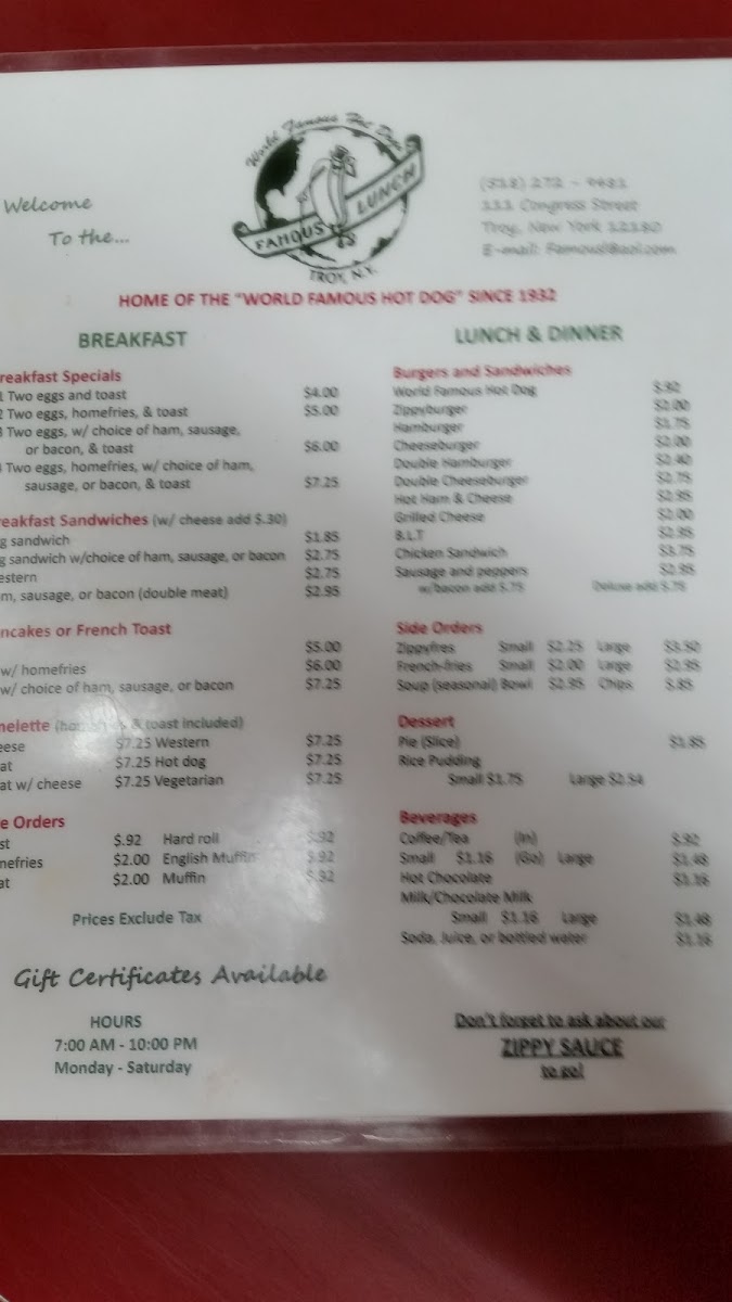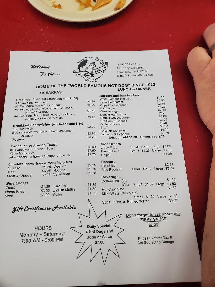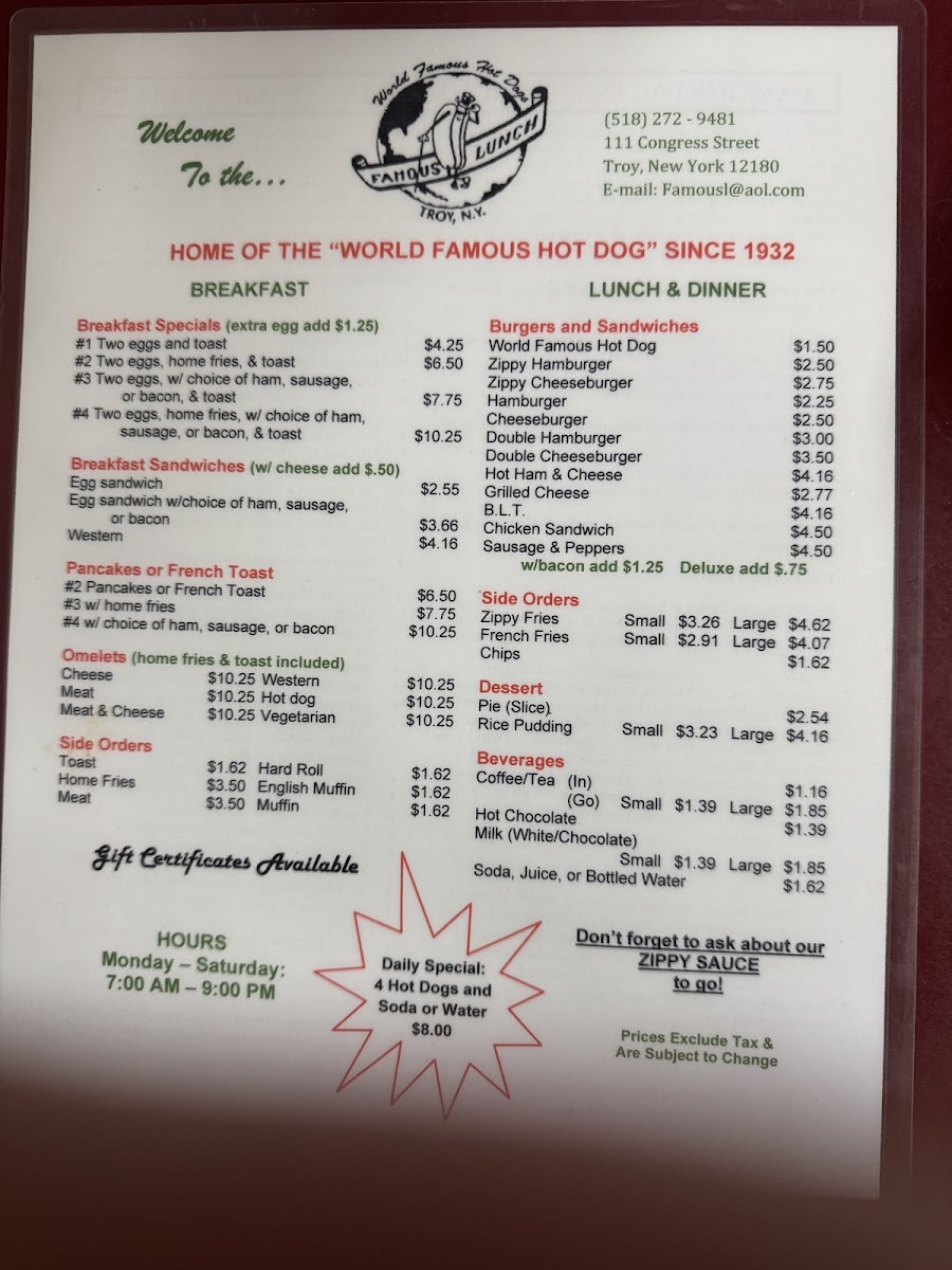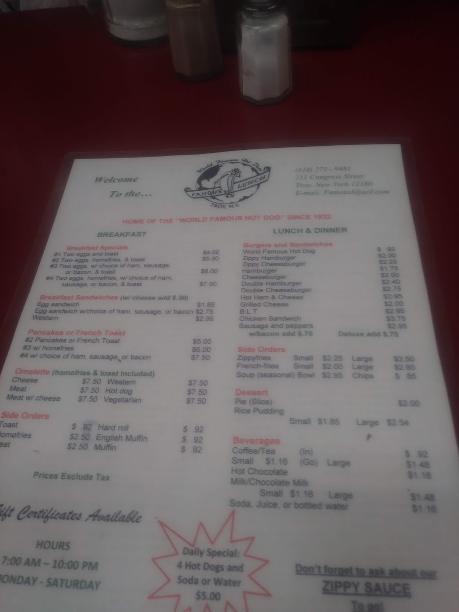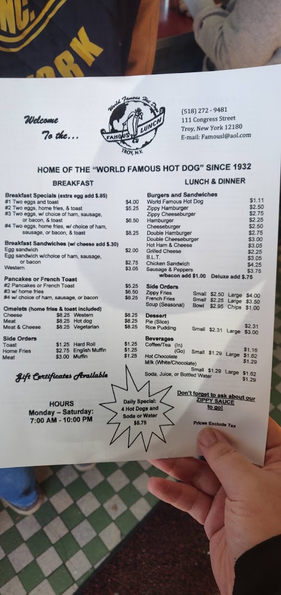 Welcome to Famous Lunch, a cherished hot dog restaurant located in the heart of Troy, New York. Known for its nostalgic charm and welcoming atmosphere, Famous Lunch serves up delightful meals that evoke sweet memories. Each item on the menu is crafted with care, from their World Famous Hot Dogs to the crispy hand-cut French fries that accompany them perfectly.